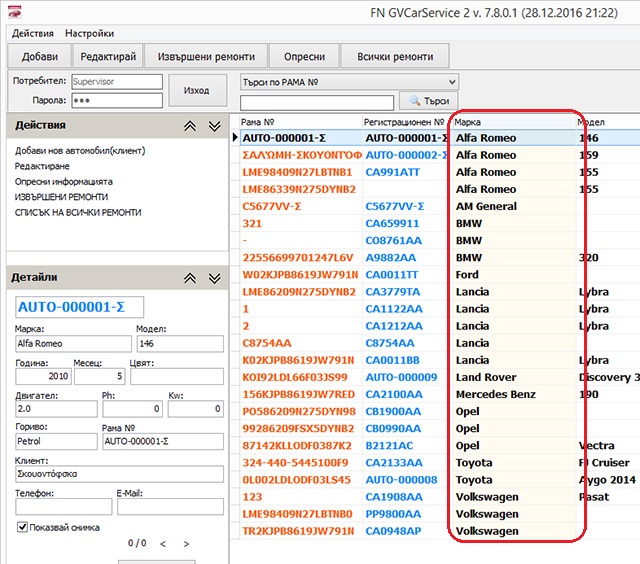 Използвайки по-съвременния тип на базата данни, включихме възможност, която ще ви бъде много полезна. На основния екран със списъка на всички автомобили на вашите клиенти, само с един клик върху името, на която и да е колона, системата ще сортира списъка по нея и така лесно ще може да намерите записите, които ви интересуват. Изборът на сортиране не е обвързан с избрания метод на търсене, както е в предишната версия на софтуера за автосервиз.