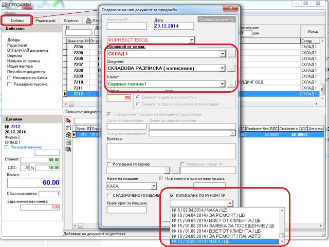 Създайте нов документ за продажба като използвате бутона "Добави". Изберете склад, от който ще се изписват частите, изберете клиент, тип на документа и най-важното е да изберете/посочите ремонтната карта, към която ще се изписват стоките от склада. От падащото меню със списъка на ремонтните карти, които чакат за части може да видите номера на ремонта, датата на регистриране, статуса и инициал на сервизната база.